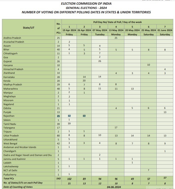 इस बार लोकसभा चुनाव (Lok Sabha Election 2024 Dates) 7 चरणों में होंगे। चुनाव आयुक्त ने कहा कि इस बार 19 अप्रैल को लोकसभा चुनाव शुरू होंगे और 4 जून को नतीजे आएंगे। सातों चरण इस प्रकार होंगे…