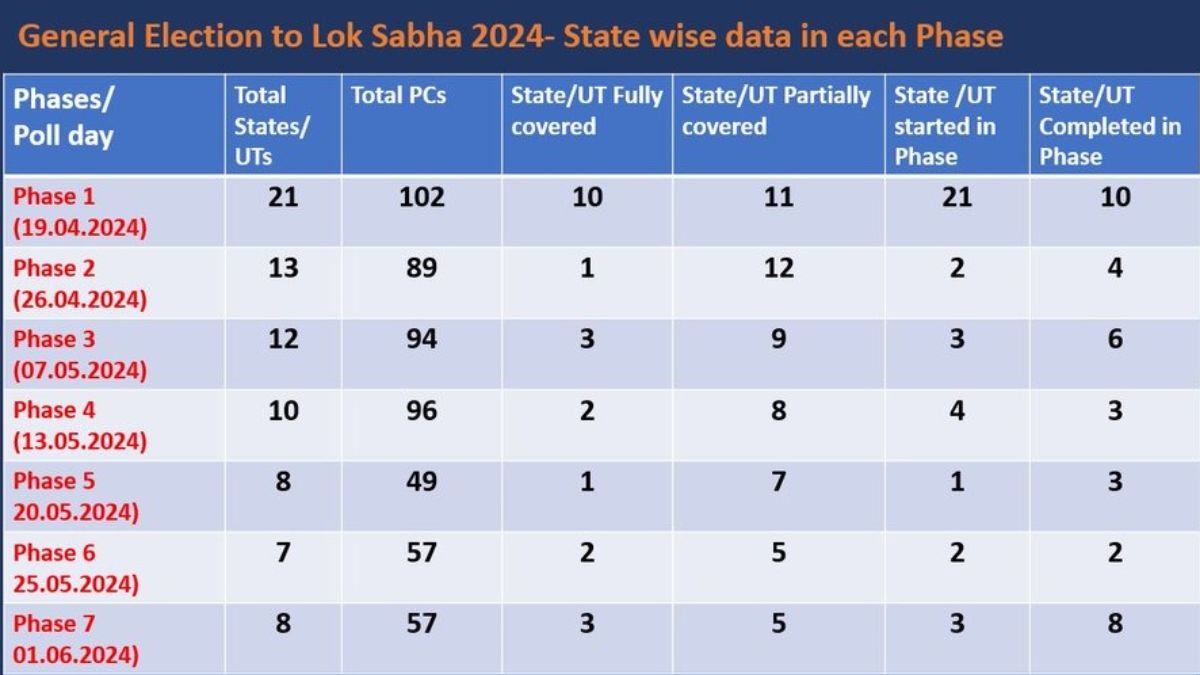 पहले चरण (Lok Sabha Poll Dates) में 21 राज्यों के कुल 102 लोकसभा सीटों पर वोटिंग होगी। वहीं, दूसरे फेज में 13 राज्यों की 89 सीटों, तीसरे में 12 राज्यों की 94 सीटों, 10 राज्यों की 96 सीटों, 8 राज्यों की 49 सीट, 7 राज्यों की 57 सीट, 8 राज्यों की 57 सीट पर वोटिंग होगी।
