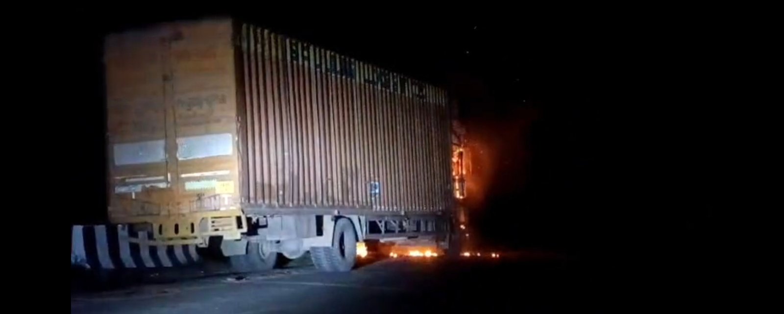 महराजगंज । जिले के श्यामदेउरवां थाना क्षेत्र के महादेव चौराहे के पास सोमवार की देर रात एक कन्टेनर ट्रक अनियंत्रित होकर सड़क किनारे लगे बिजली के पोल से टकरा गया। टक्कर इतनी जोरदार थी कि बिजली का पोल टूट गया और ट्रक में आग लग गई। देखते ही देखते आग ने विकराल रूप ले लिया और पूरे इलाके में अफरा-तफरी मच गई।