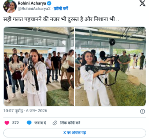 पटना: बिहार के पूर्व सीएम लालू यादव की बेटी रोहिणी आचार्य अक्सर सोशल मीडिया पर अपने पोस्ट की वजह से चर्चा में रहती हैं। हालही में सोशल मीडिया पर उनका अलग अंदाज दिखा है। एक्स पर पोस्ट की गई तस्वीर में रोहिणी आचार्य हाथ में बंदूक पकड़कर निशाना लगाते हुए दिखी हैं। इस फोटो के कैप्शन में रोहिणी ने लिखा, “सही गलत पहचानने की नजर भी दुरुस्त है और निशाना भी ..”